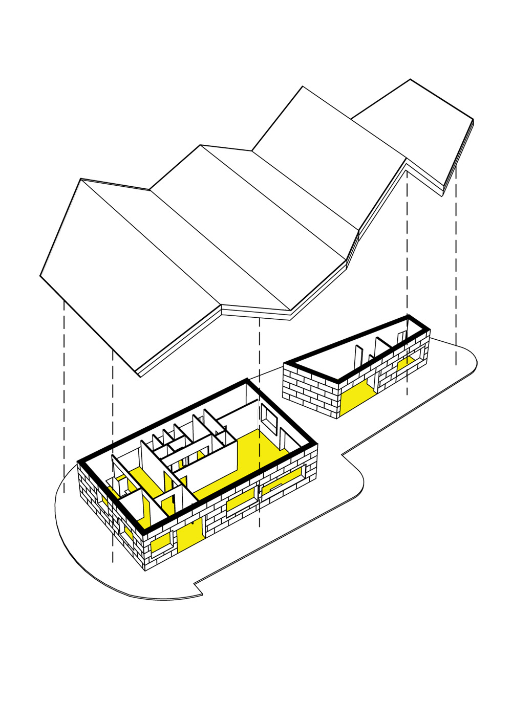 The building elements have a clear reference to the construction practice of Gorski kotar: a slanted tin roof, and asbestos-cement facades.