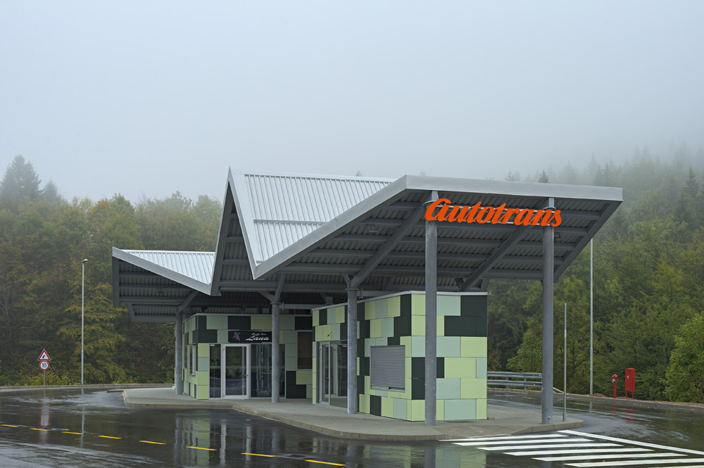 The bus station consists of two architectural elements: the bus shelter and accompanying retail building, and the large zigzag roof covering the platform and bus shelter area.